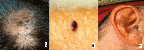 Melanoma lentigo maligno (MLM) – Figura C - É pouco freqüente, com 5% dos casos, e é mais comum o aparecimento entre sexta e sétima décadas de vida. Geralmente surge em área de lentigo solar que se apresenta como mácula acastanhada ou enegrecida, de limites nítidos e irregulares, alcançando vários centímetros de diâmetro, localizada na face em 90% e em mãos e membros inferiores (10%). Após longo período de crescimento radial, ocorre a invasão perpendicular à superfície, caracterizada clinicamente pela presença de nódulo elevado, em meio a diversos tons de pigmentação, como castanho-escuro, negro e azulado.